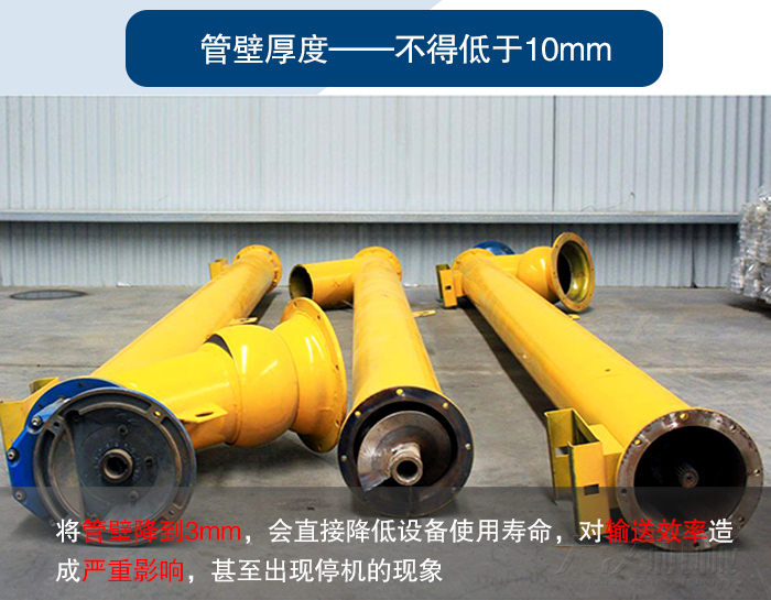 一般情況下,管式螺旋輸送機管壁厚度要求不低于10mm,有些廠家為了在其中賺取更多利益,將管壁降到了3mm,會直接降低設(shè)備使用壽命,對輸送效率造成嚴(yán)重影響,甚至出現(xiàn)停機的現(xiàn)象。