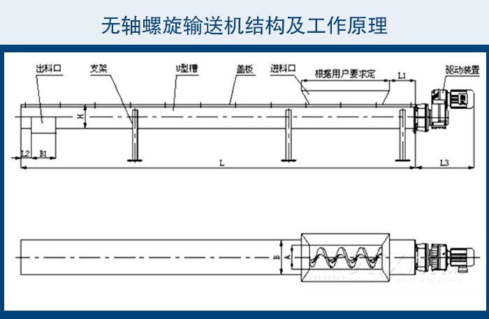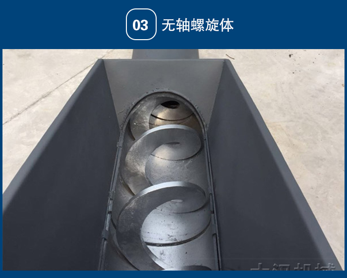 該設(shè)備采用無(wú)軸螺旋式,當(dāng)物料從輸送機(jī)的進(jìn)料斗進(jìn)入,依靠螺旋葉片的旋轉(zhuǎn)將物料推移滑行,沿U型輸送槽送至出料口,并與壓榨機(jī)或垃圾小車(chē)配套,將物料進(jìn)行下一步處理。
