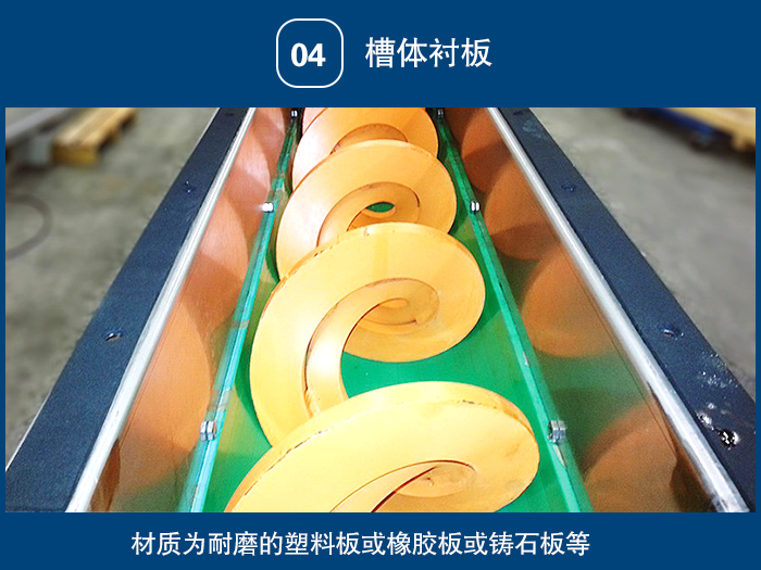4)槽體襯板:材質(zhì)為耐磨的塑料板或橡膠板或鑄石板等。進(jìn)、出料口:有方形和圓形兩種,一般進(jìn)、出料口形式由用戶決定。