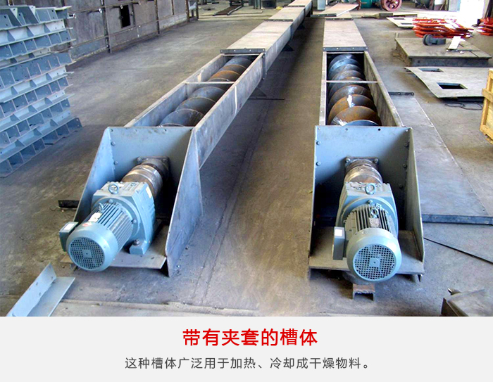煤粉螺旋輸送機(jī)這種形式的槽體由加工好的夾套連續(xù)地焊接在普通結(jié)構(gòu)的槽體上,其上焊有換熱介質(zhì)的進(jìn)出口管。這種槽體廣泛用于加熱、冷卻成干燥物料。夾套中的隔板使循環(huán)水較好地分配面強(qiáng)化熱交換效果。